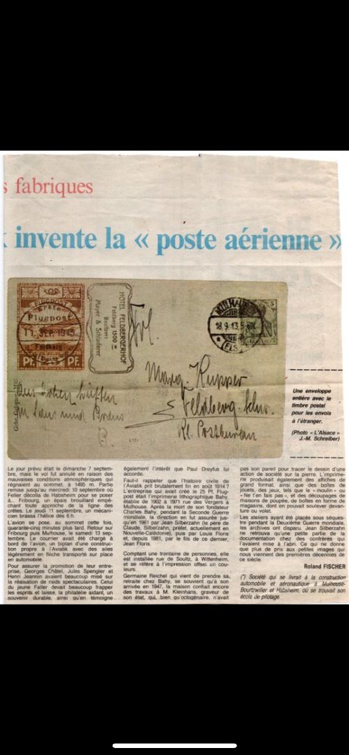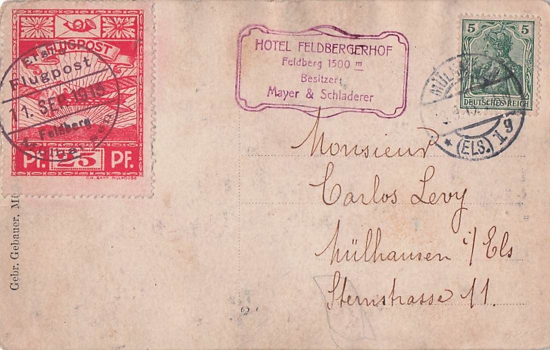 Deutschland, Deutsches Reich, Halbamtliche Flugmarken, Nr.10, Mülhausen-Feldberg, auf Ansichtskarte von Artur Faller mit Unterschrift, Karte geprüft Katalogwert