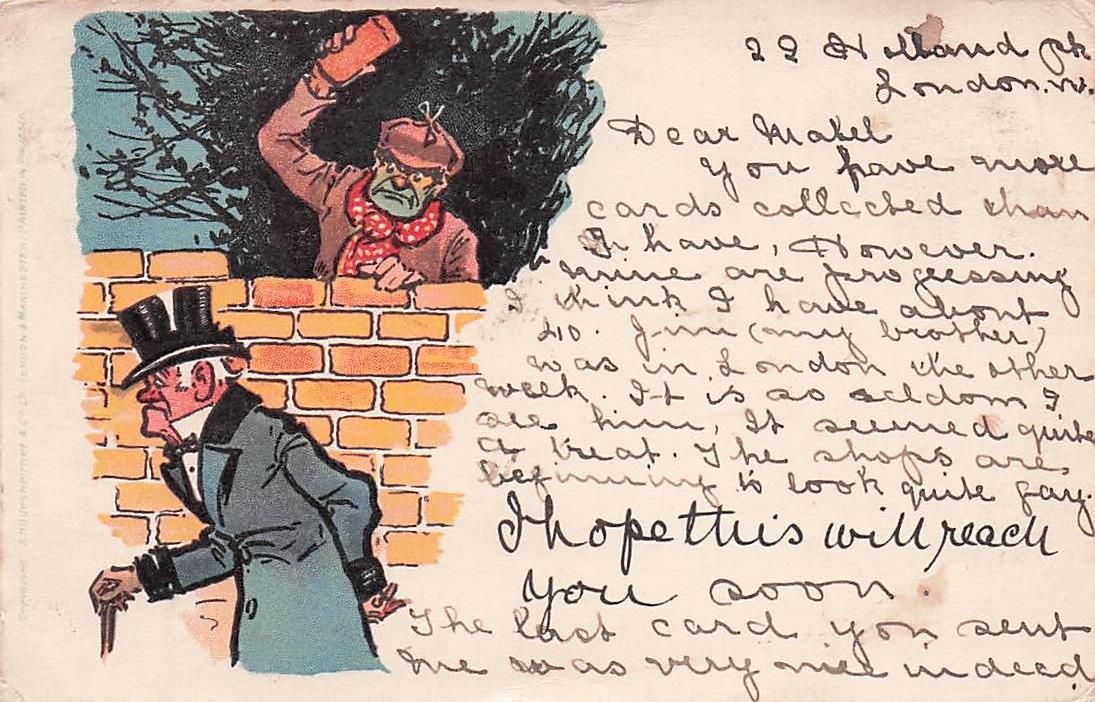 Ein anderer Mann, der sich hinter einer Ziegelmauer versteckt und scheinbar einen Gegenstand über den Kopf des ersten Mannes schwingt.