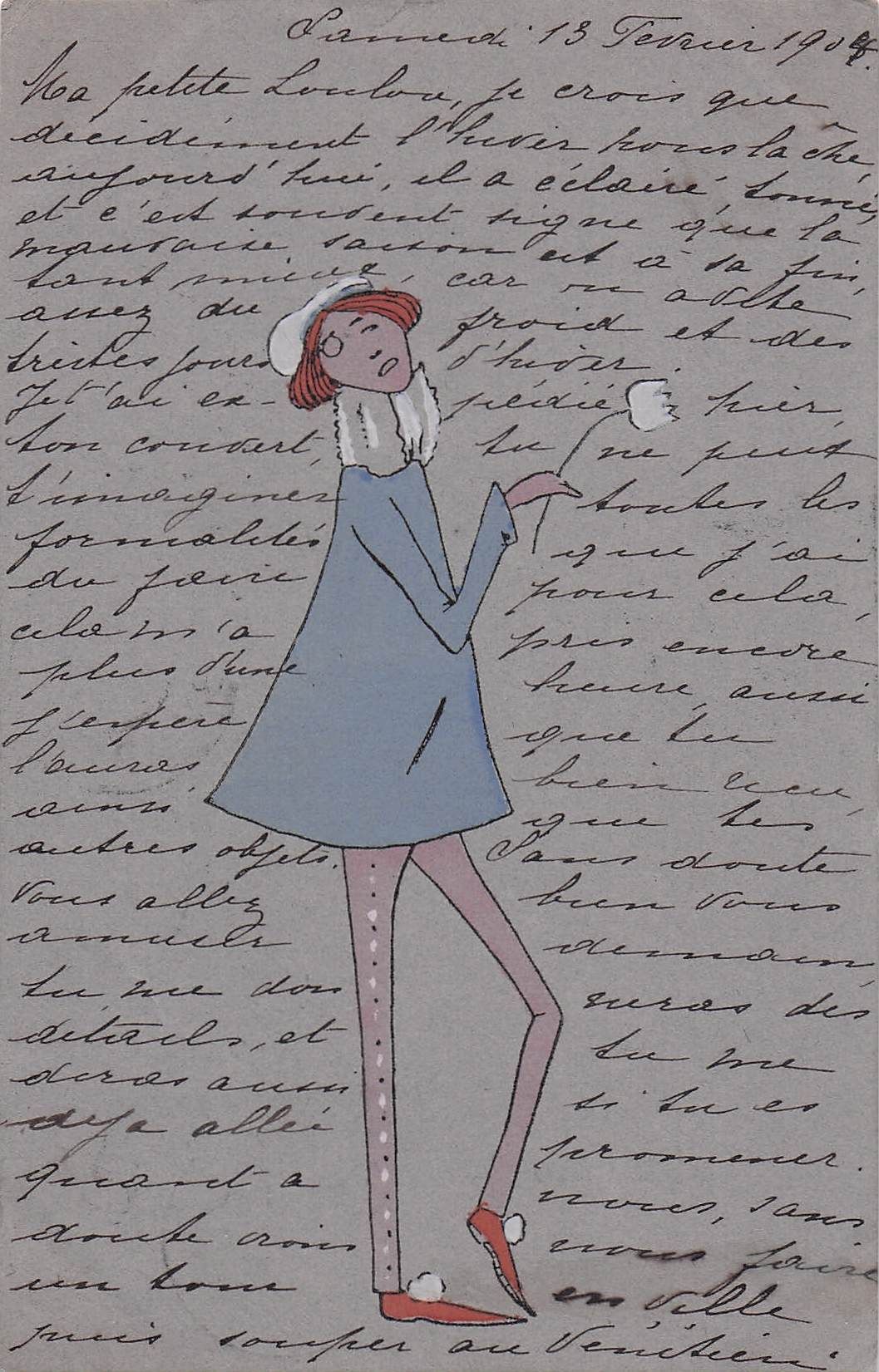 Die Abbildung zeigt eine Postkarte mit einem Mode-Entwurf des französischen Künstlers und Designers Kardin Tebuer aus dem Jahr 1904. Sie stellt eine Dame in einem grauen Mantel und gestreiften Strümpfen dar.