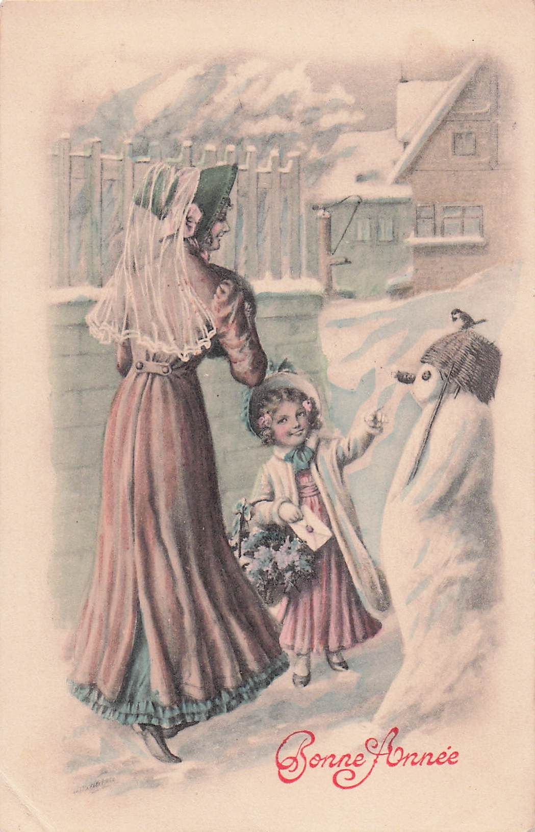 Frohes Neues Jahr – Kleines Mädchen zeigt ihrer Mutter einen Schneemann