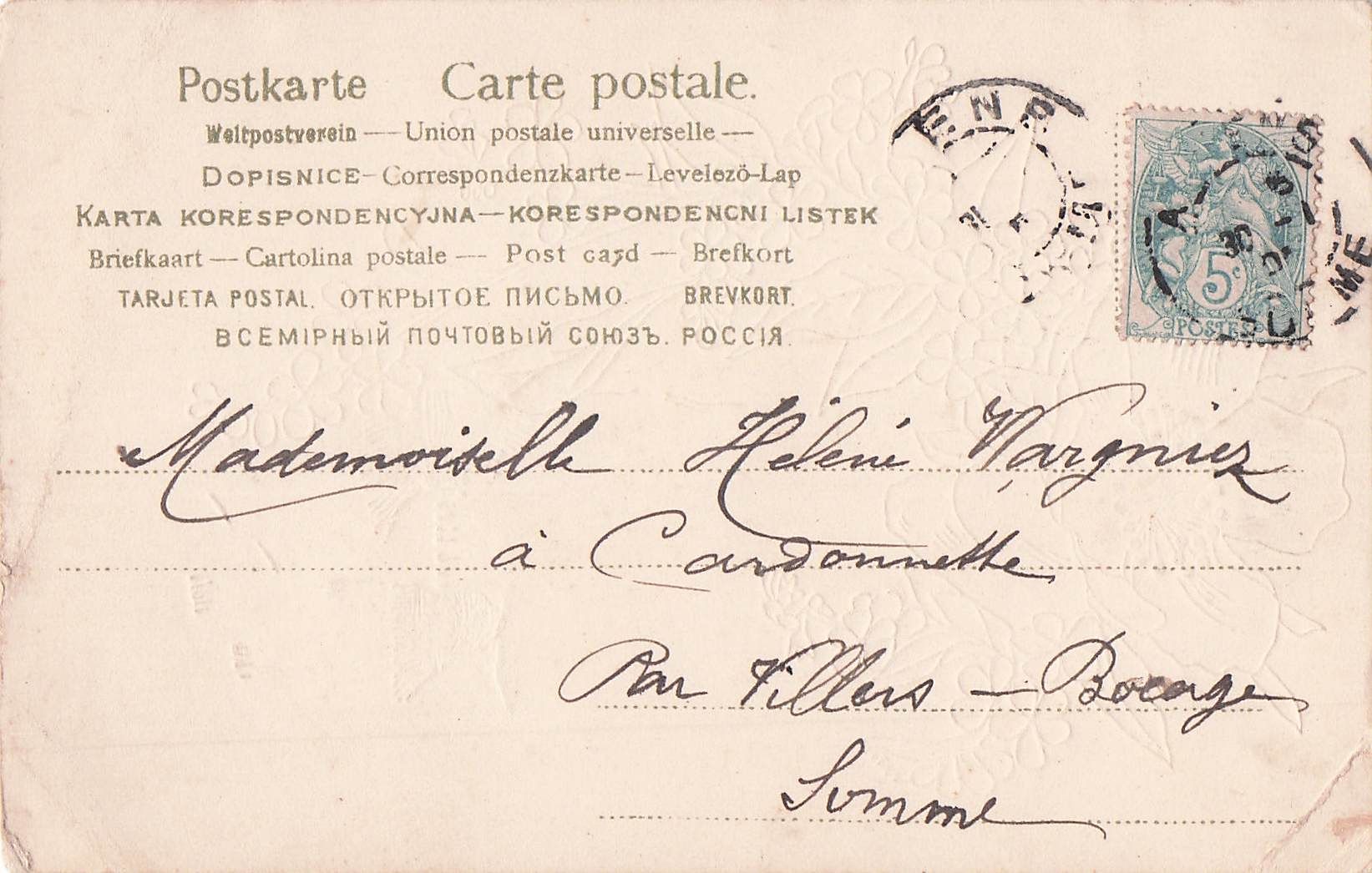 Karte zeigt große, rosa Blüten (möglicherweise Hagebutten) und kleine, blaue Vergissmeinnicht.