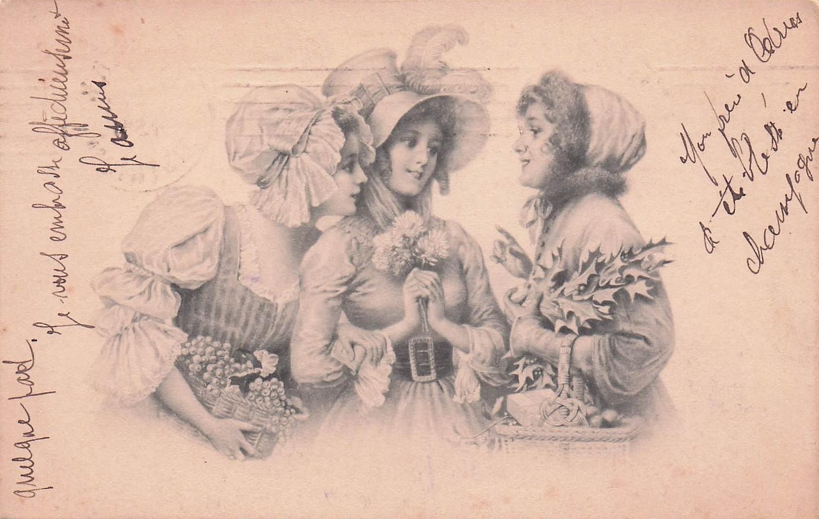 Künstler Ak Drei junge Frauen, Weintrauben, Stechpalmenzweige