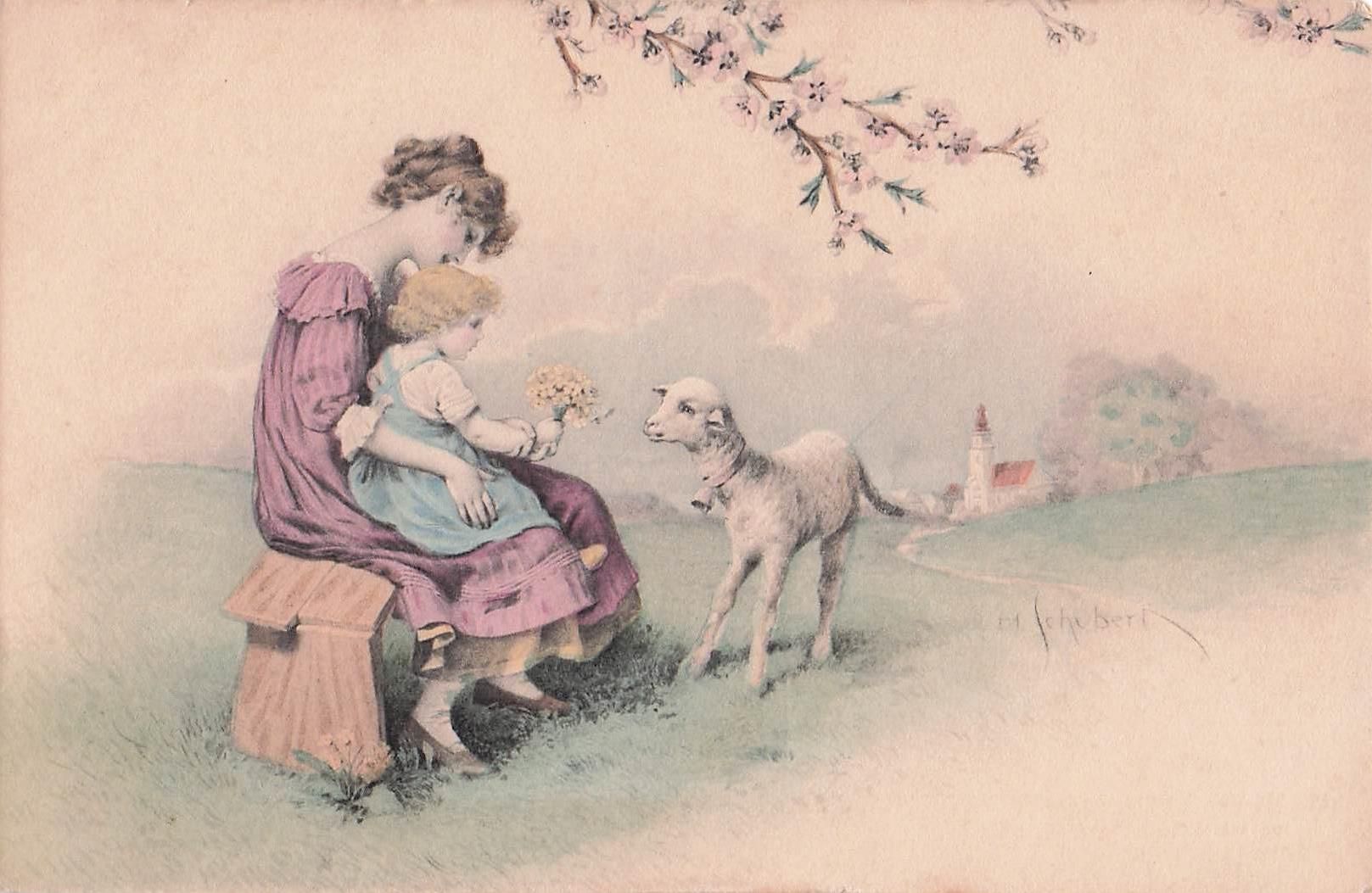 Künstler-AK H. Schubert: Frau mit Mädchen auf dem Schoss und Lämmlein, Ostergruss