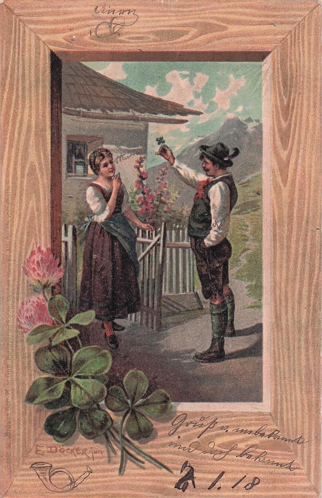 Künstler-Ansichtskarte E. Döcker: Mann überreicht seiner Frau ein Vierblättriges Kleeblatt
