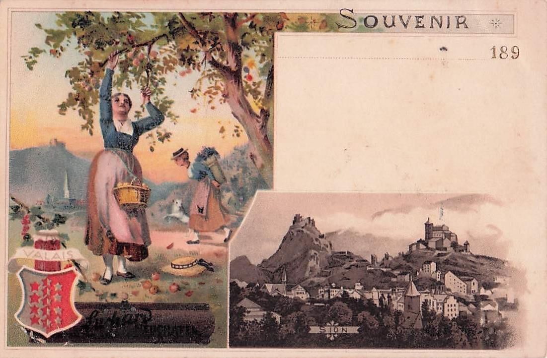 Lithographie Sion, Panorama, Reklame für Suchard