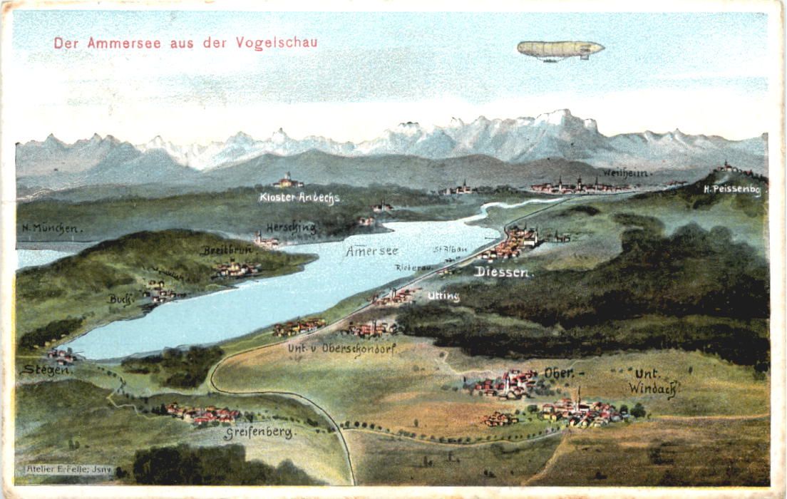 Der Ammersee aus der Vogelschau - Künstler Ak Eugen Felle
