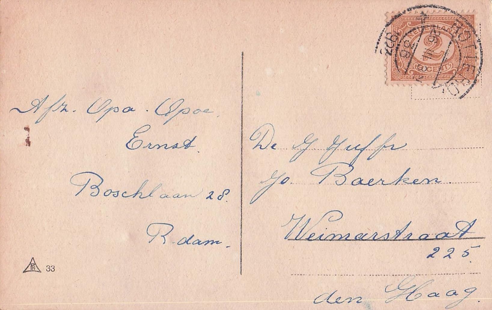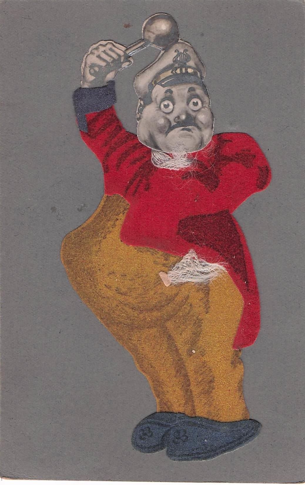 Filz-Ansichtskarte, die einen Mann mit übertriebenen Proportionen in einem roten Sakko und gelber Hose darstellt.