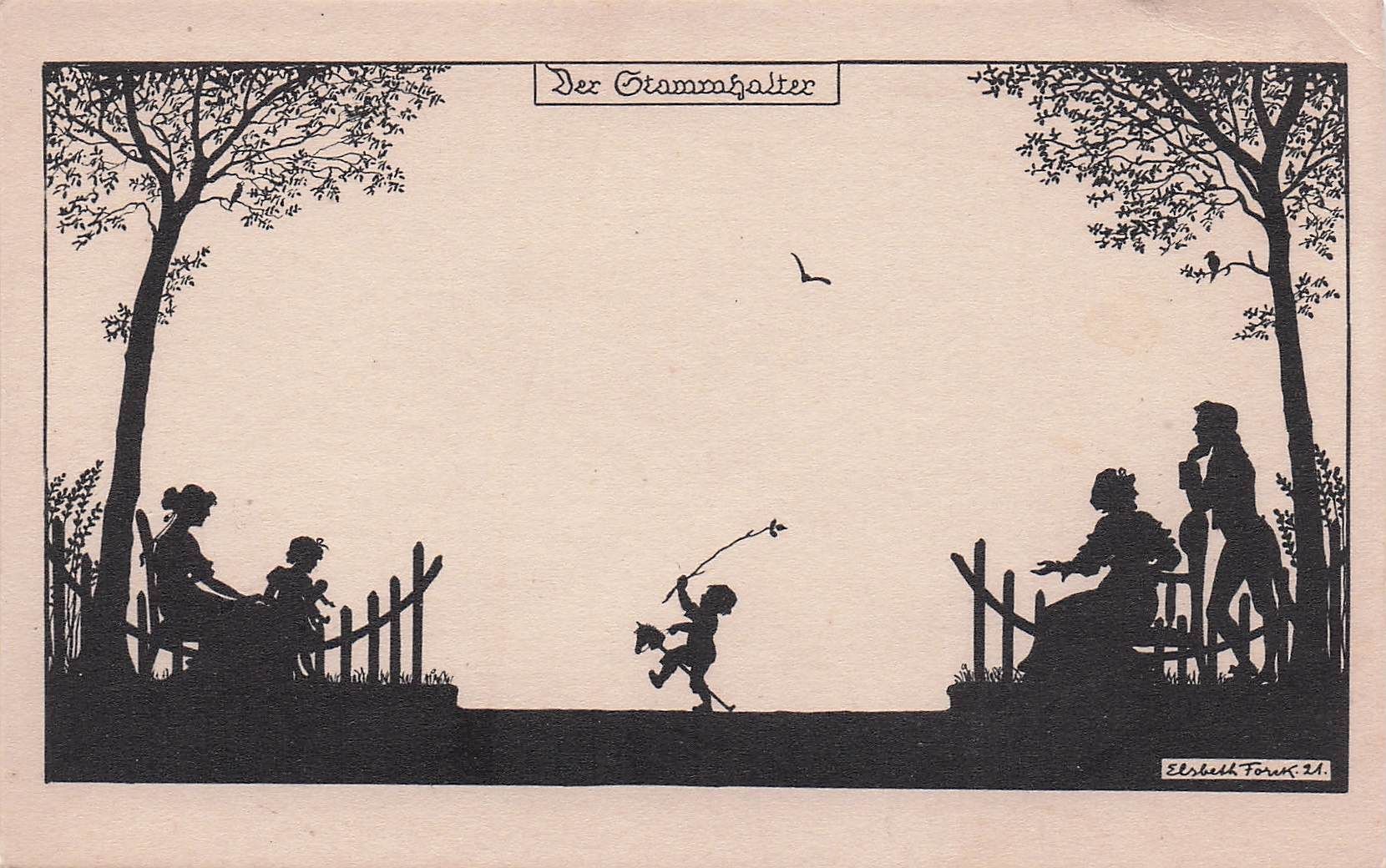 Künstler-AK Elsbeth Forck: Der Stammhalter, kleiner Junge auf Steckenpferd, Schattenbild