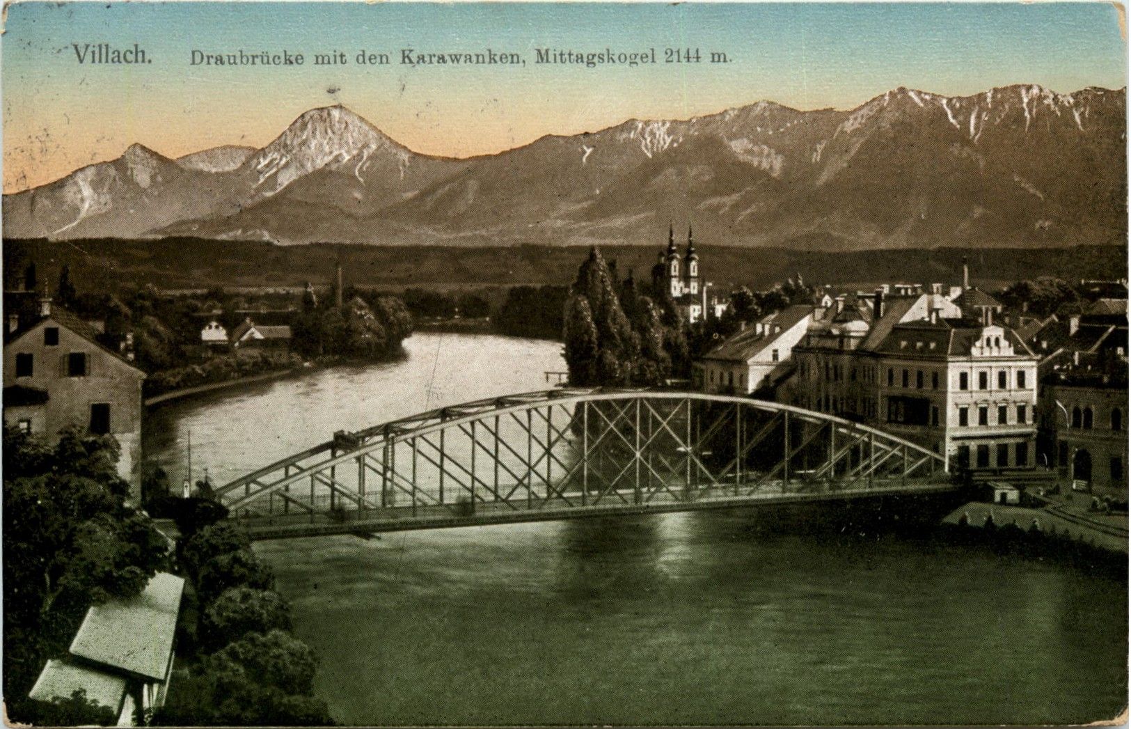 Villach, Draubrücke mit den Karawanken, Mittagskogel