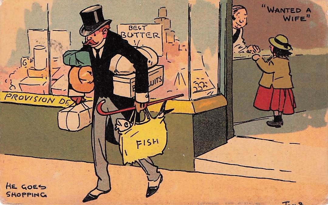 Vintage Tom Browne Comic Postkarte 1908 Shop Front WANTED A WIFE