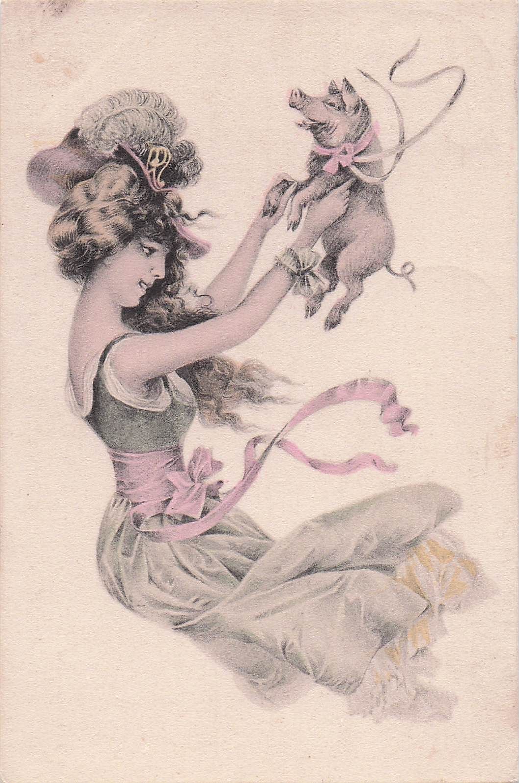 Künstler-AK Junge Frau mit kleinem Schwein