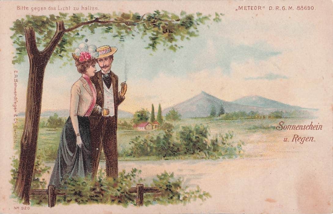 Lithographie Paar spaziert im Sonnenschein, Im Gegenlicht bei starkem Regen, Halt gegen das Licht