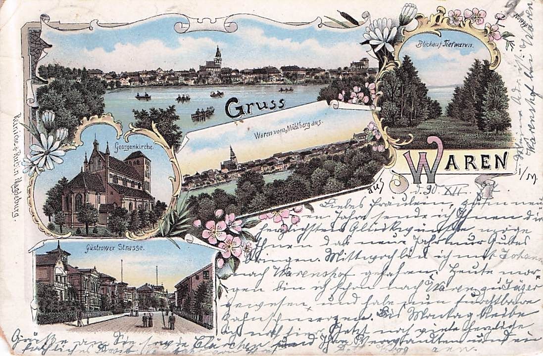 Lithographie Waren i. M., Georgenkirche, Güstrowerstraße, Gesamtansicht