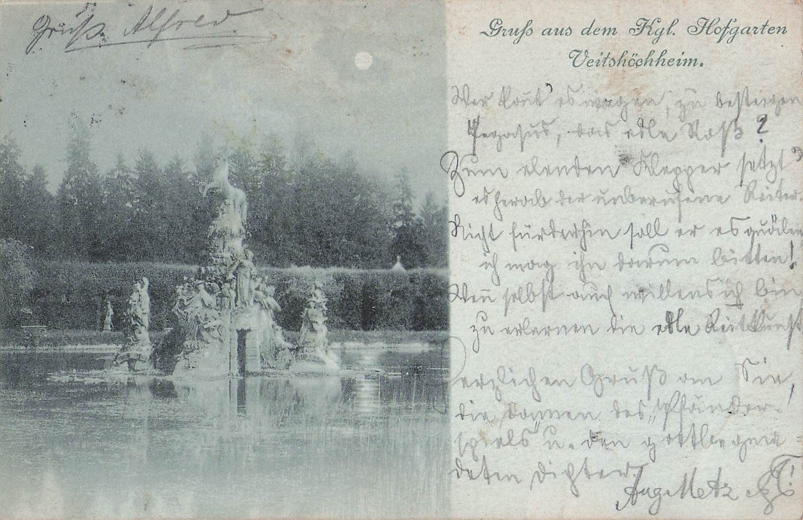 Mondschein-AK Veitshöchheim, Königlicher Hofgarten, Statue
