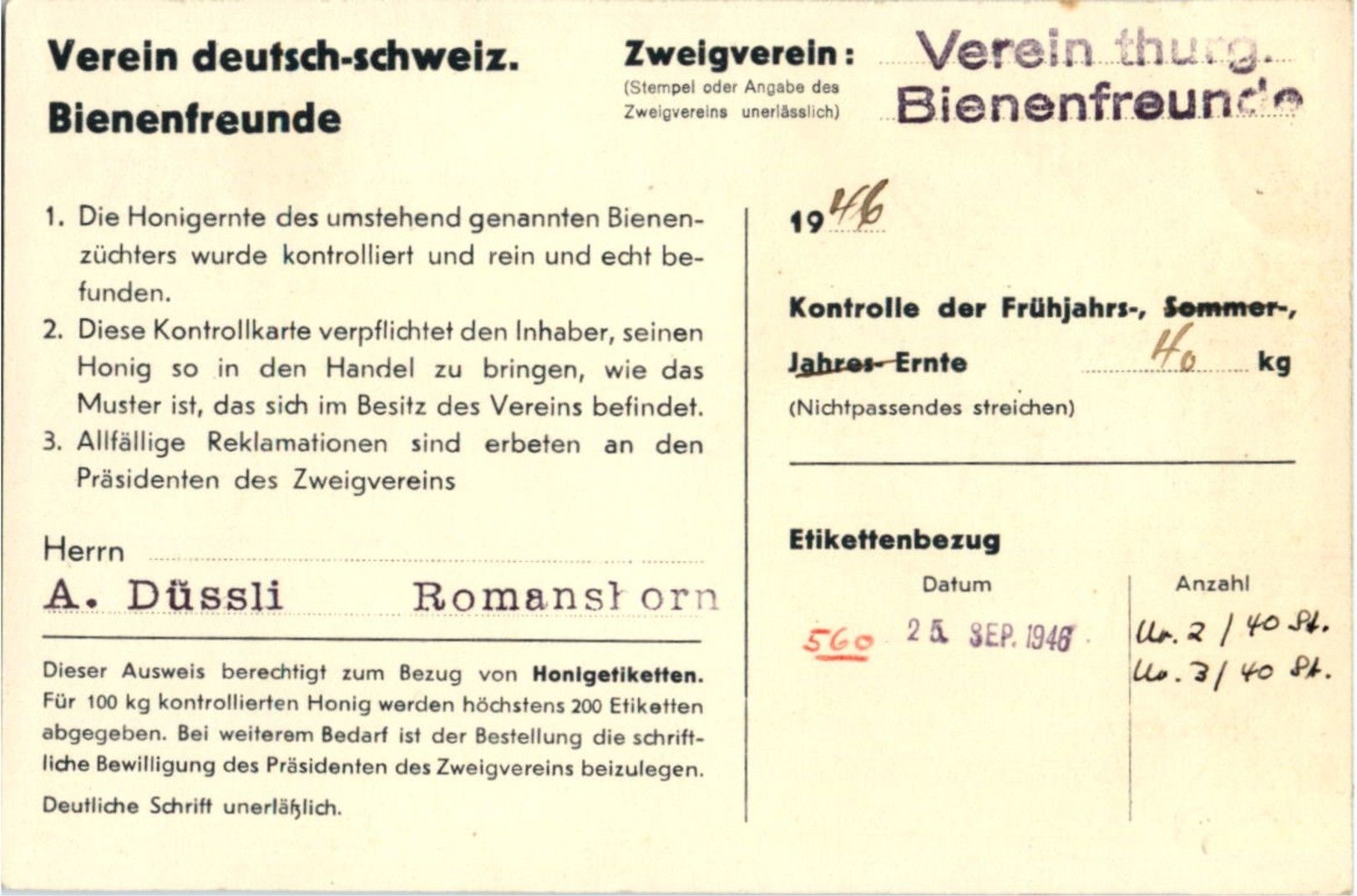 Romanshorn - Honig Kontrollkarte 1946