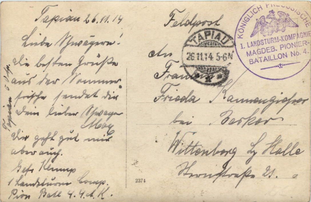 Soldaten 1. Landsturm Magdeburg Pionier Batl. 4 gelaufen in Tapiau - Ostpreussen